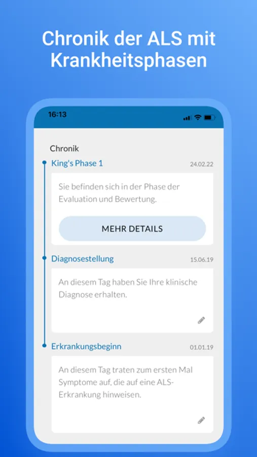- NACHRICHTENFUNKTION: Push-Nachrichten dienen unter anderem als Erinnerung zum Ausfüllen der ALS-Funktionsskala, zur regelmäßigen Sprach- und Mimik-Analyse und zur Information über den Stand der Versorgung eines Hilfsmittels.