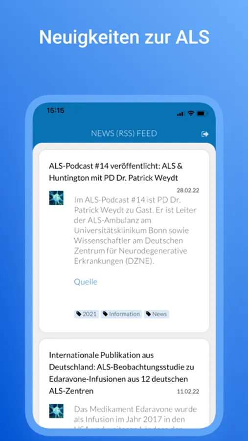 - NEUIGKEITEN: Newsfeed mit Nachrichten zum Krankheitsbild, zur Forschung, zur Behandlung und Versorgung der ALS.