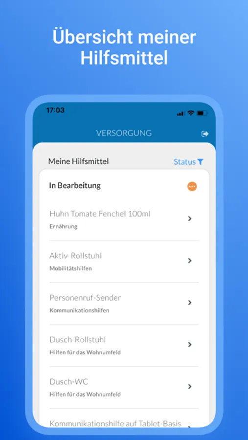 - ÜBERSICHT DER HILFSMITTELVERSORGUNG: alle aktuellen und zurückliegenden Versorgungen mit Hilfsmitteln werden angezeigt.