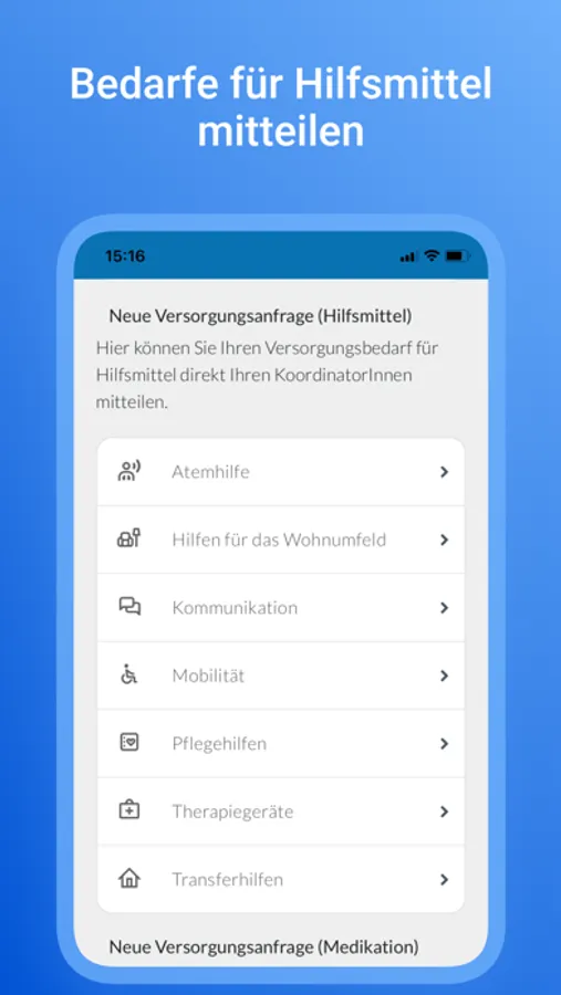 - BEDARF FÜR HILFSMITTEL MITTEILEN: werden Hilfsmittel benötigt, können Sie diesen Bedarf über die App Ihren ALS-Lotsinnen und Lotsen mitteilen.