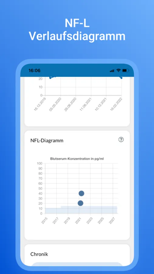 - NF-L ALS BIOMARKER DER KRANKHEITSAKTIVITÄT: Die Analyseergebnisse des Biomarkers Neurofilament light chain (NF-L) werden in einem Diagramm angezeigt und altersabhängig im Krankheitsverlauf interpretiert.