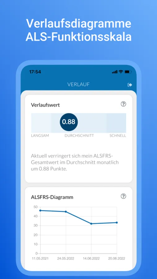 - DARSTELLUNG DES INDIVIDUELLEN VERLAUFS DER ALS: Durch die Beantwortung der ALS-Funktionsskala wird der individuelle Krankheitsverlauf angezeigt und die Krankheitsgeschwindigkeit eingeschätzt.