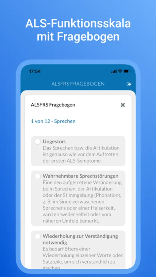 Die ALS-App ist die führende digitale Gesundheitsanwendung für Menschen mit Amyotropher Lateralsklerose (ALS) in Europa und bietet folgende Funktionen: