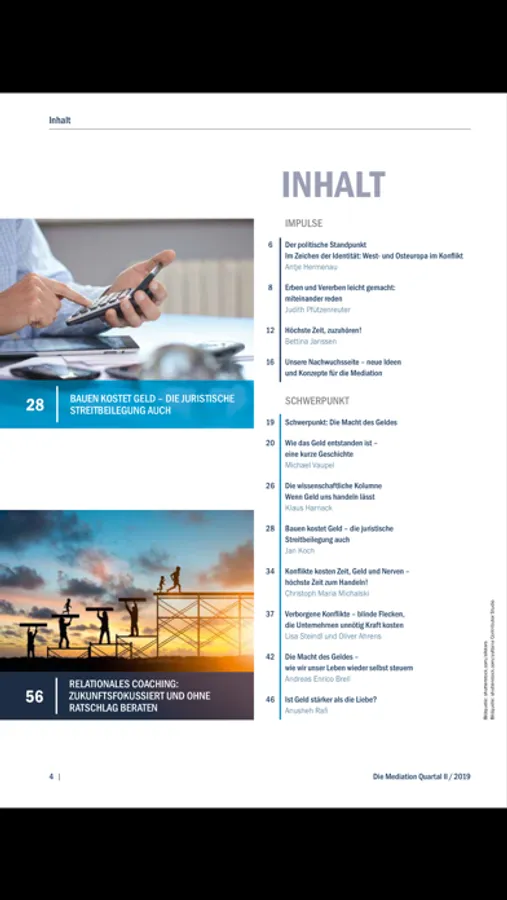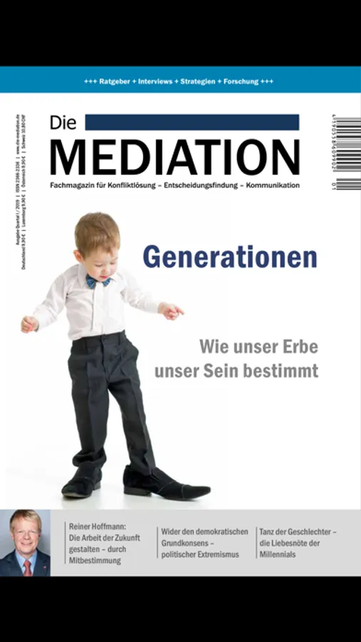 Die Mediation ist mit 13.000 gedruckten Exemplaren die auflagenstärkste Mediationszeitschrift und in über 3.300 Verkaufsstellen verfügbar. Die Zeitschrift erscheint quartalsweise und bietet ein multimediales Erlebnis für Ihre Weiterbildung auf dem Gebiet der Konfliktlösung.