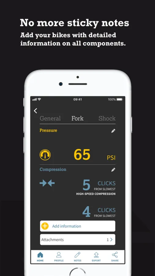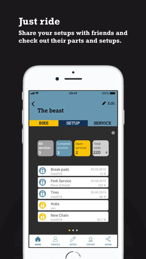Focus – You always know what service has been done and when. Your setups are stored so you always remember them. Share your setups with friends and check out their parts and setups.