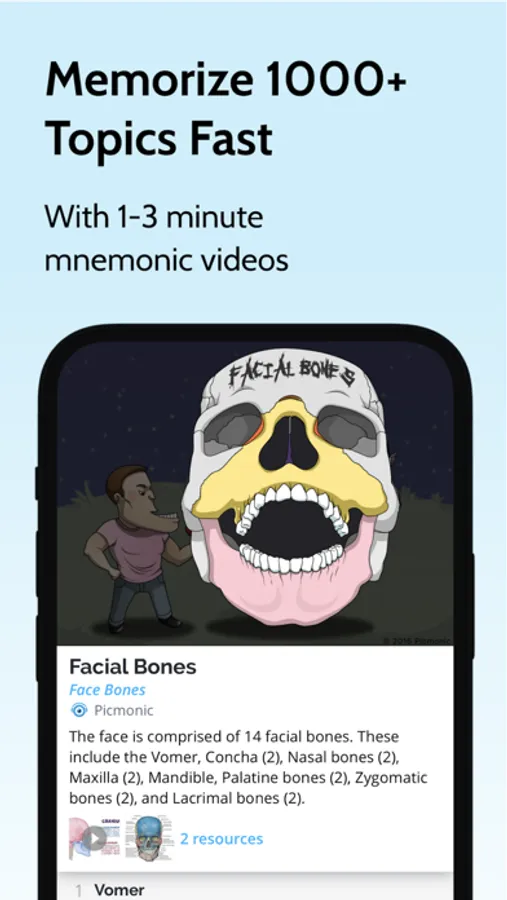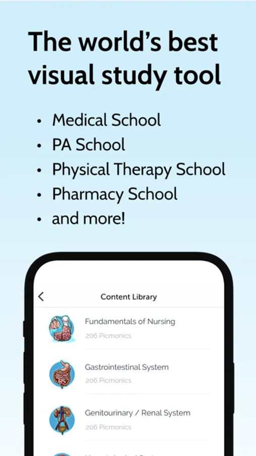 Struggling to remember all the high-yield facts from First Aid, Pathoma, Robbins & Goljan, or Boards and Beyond? Picmonic forms a mental scaffold of memory anchors so that you show up to lecture prepared to remember everything you learn so you ace course exams and then your USMLE Q Bank score goes 250+. Get a question wrong with UWorld USMLE, Osmosis, Firecracker, USMLE RX, SMARTYPANCE or Kaplan QBanks, hop over to Picmonic to review and start enjoying school! Read more information Medscape style and save time vs watching Amboss or Lecturio videos. Repetition is key to success, so utilize our Anki / Memorang style Spaced Repetition Daily Quiz on your phone on the go to make any moment a study moment :)