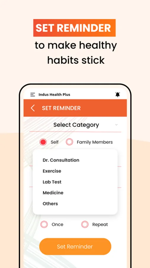 - Set reminder – Set reminder for Self & Family Members for Medication, Dr Consultation, Exercise, Others etc.