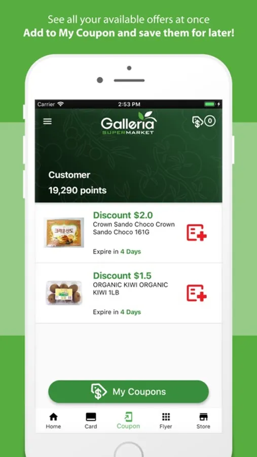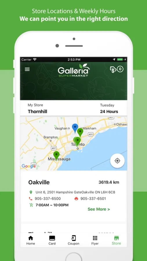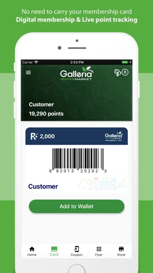 Information for store location, membership card to scan and add to wallet app, search the latest five shopping histories.