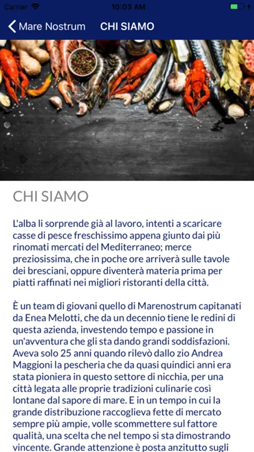 È un team di giovani quello di Marenostrum capitanati da Enea Melotti, che da un decennio tiene le redini di questa azienda, investendo tempo e passione in un'avventura che gli sta dando grandi soddisfazioni. Aveva solo 25 anni quando rilevò dallo zio Andrea Maggioni la pescheria che da quasi quindici anni era stata pioniera in questo settore di nicchia, per una città legata alle proprie tradizioni culinarie così lontane dal sapore di mare. E in un tempo in cui la grande distribuzione raccoglieva fette di mercato sempre più ampie, volle scommettere sul fattore qualità, una scelta che nel tempo si sta dimostrando vincente. Grande attenzione è posta anzitutto sugli approvvigionamenti: un gran numero di fornitori scelti con cura, andando di persona sui mercati o stringendo legami molto stretti con chi ha fatto della pesca il proprio vivere quotidiano, per evitare quei passaggi intermedi che nuocciono ad un prodotto delicato come il pesce e poter così garantire alla clientela i prodotti tipici di ciascuna zona di cattura.