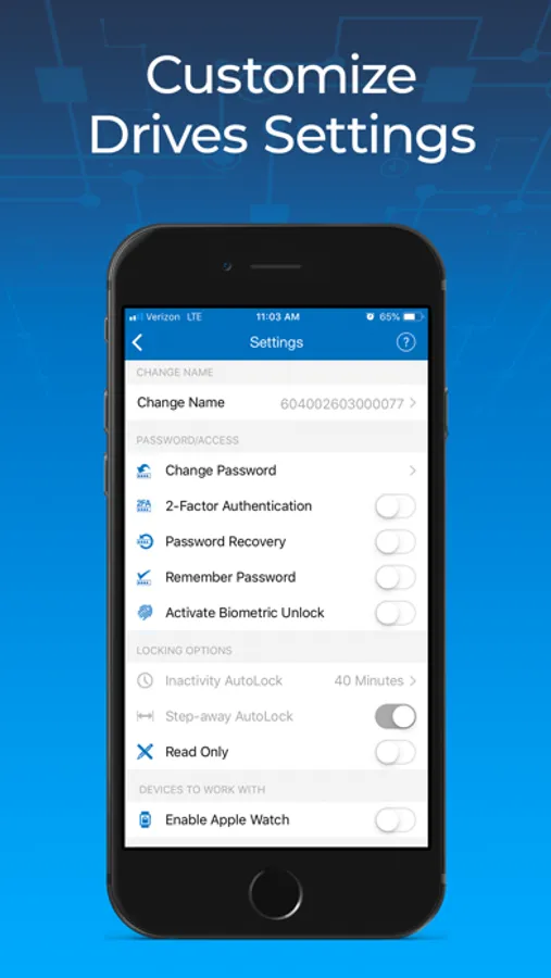 SecureData Lock BT technology ( by ClevX) allows you to access and control your SecureDrive® BT or SecureUSB® BT from your iOS devices. Authenticate with PIN, FaceID, or TouchID for an added layer of security for your information.