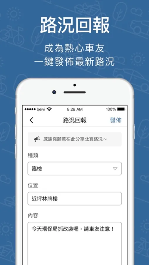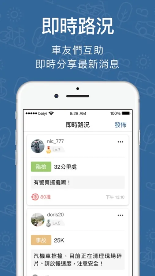 在出門上山兜風前能夠立即知道今日路況,無論是黑箱、臨檢、事故,都能夠一手掌握,也可以透過平台分享路況成為其他車友的神助攻。