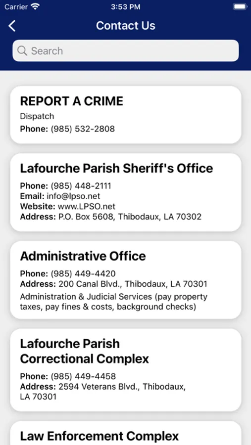 The Lafourche Parish Sheriff’s Office mobile application is an interactive app developed to help improve communication with area residents. The Lafourche Parish Sheriff App allows residents to connect with the Lafourche Parish Sheriff’s Office by reporting crimes, submitting tips, and other interactive features, as well as providing the community the latest public safety news and information.