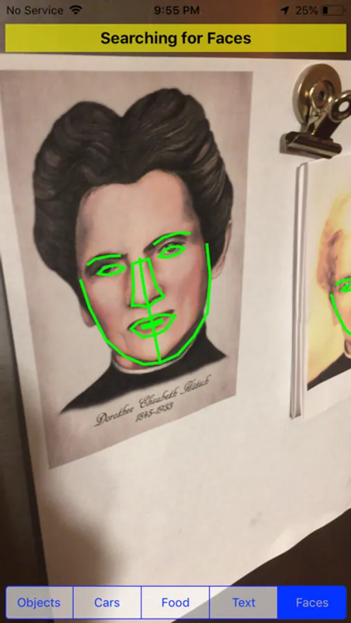 The "People" mode looks for all potential human or human-like faces. Of those found, the app highlights the facial landmarks, such as eyes, nose, jawline, etc. This mode in particular works better on a newer device at a usable framerate, due to the hardware required for real-time image processing. It also supports upper torso detection (back camera) and facial segmentation or depth map (front camera).