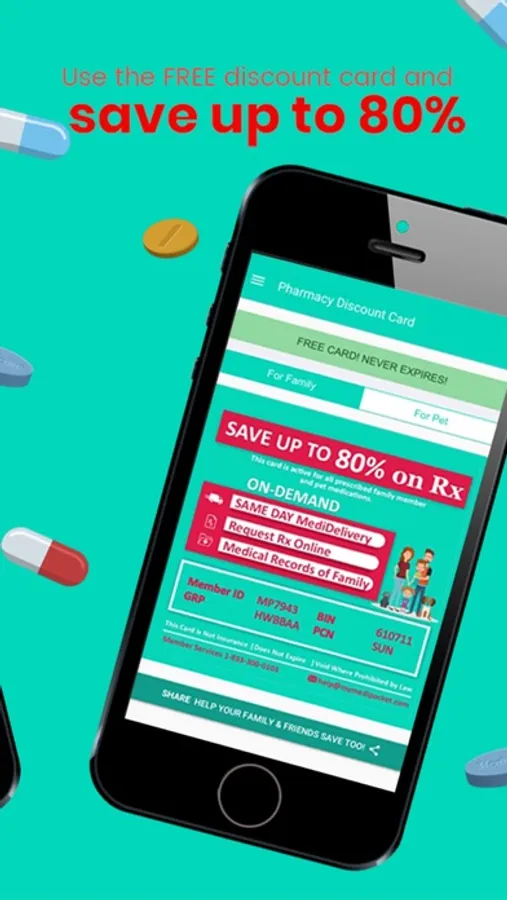 Using the discount card is simple! It is stored in the app under your profile - simply hand your phone to the pharmacist to save up to 80% and ask them to save the card to your profile in their pharmacy system. With our app, there is no need to save or print the discount card again and again- you can find savings on the go! And with just a click, you can share with your family and friends to help them save too!