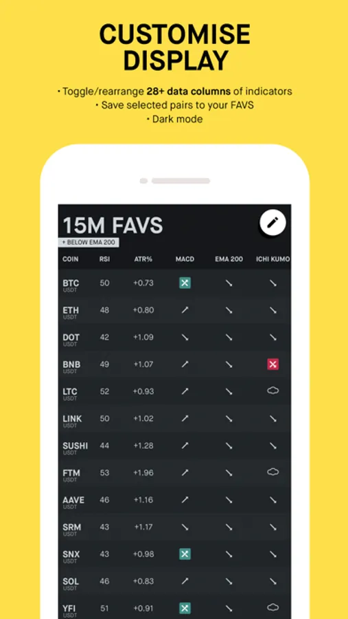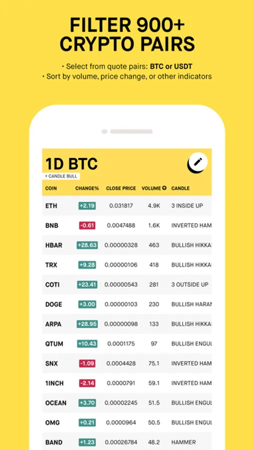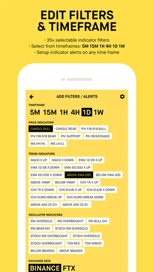 Crypto screener app for traders. Collectively filter 600+ Binance coins by technical indicators and add alerts on different time frames: 5 minute, 15 minute, 1 hour, 4 hour, 1 day, and 1 week.