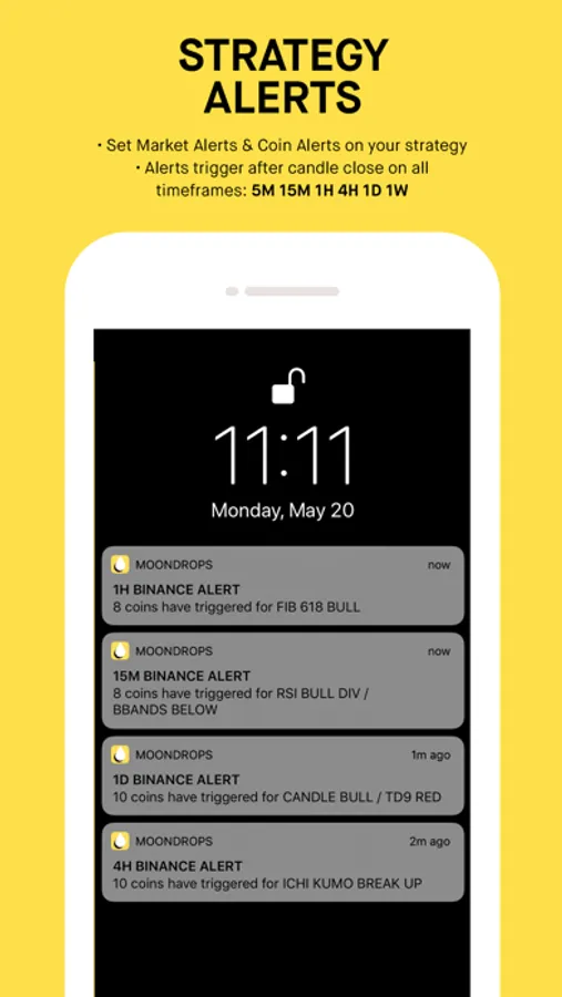 Moondrops monitors 6 timeframes (5M, 15M, 1H, 4H, 1D, 1W) and runs an analysis after each candle close. More than 35+ technical analysis indicators are processed for 600+ trading pairs on Binance. Custom filter alerts are sent to subscribed users, and data is synced to the mobile app.