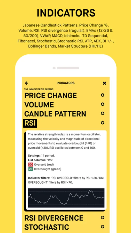 Use the indicator results to sort and filter your list, or combine indicators to create advanced strategies.
