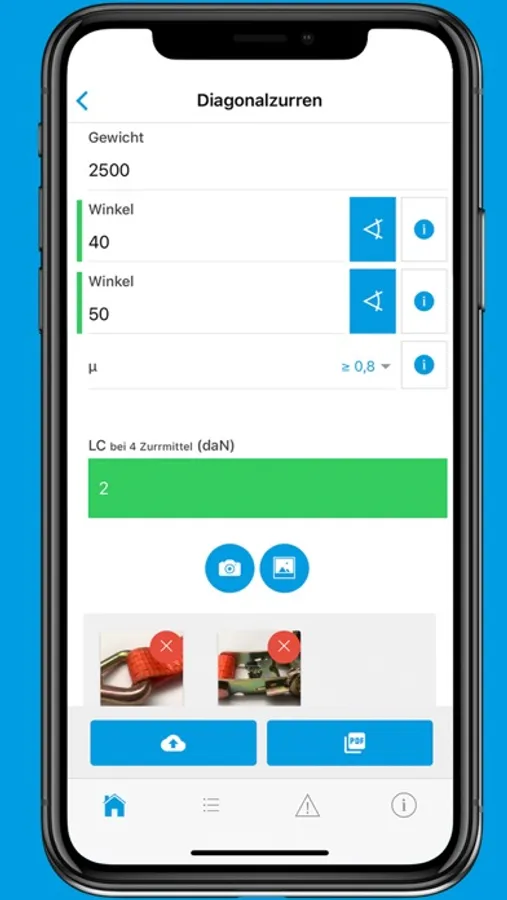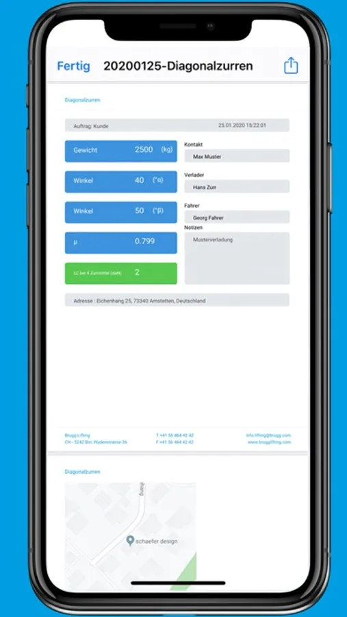 After activating the PRO option, you can save the calculations completed by you. You can add images, audio and video files to the calculations. Moreover, you may determine the location of any calculation via GPS. The calculations may be backed up as PDF files or on the server made available by Brugg Lifting AG. In order use the backup feature, you need to register with Brugg Digital.