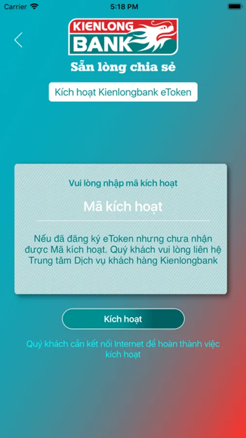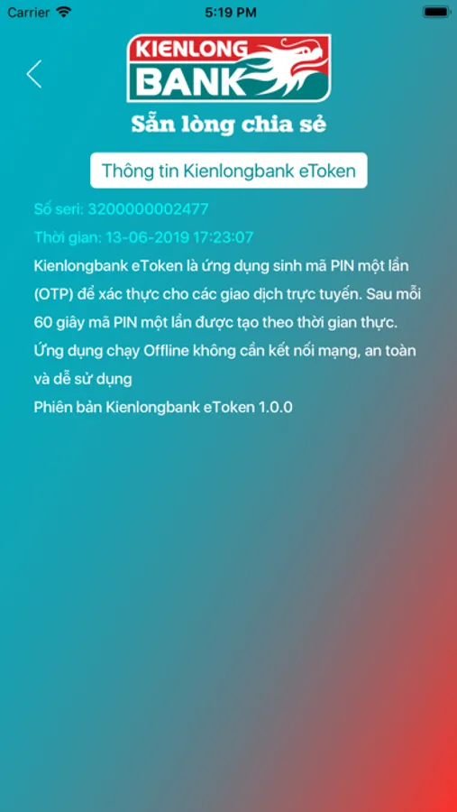 Kienlongbank eToken là ứng dụng để lấy mã xác thực (OTP) giao dịch và gắn duy nhất với tài khoản đăng nhập Internet Banking của khách hàng, được cài đặt ngay trên thiết bị di động của Khách hàng. Kienlongbank eToken là phương thức xác thực công nghệ hiện đại, bảo mật nhất hiện nay được Kienlongbank áp dụng trong các giao dịch Internet Banking, thể hiện cam kết an toàn - bảo mật tối đa, mang lại cho khách hàng những trải nghiệm hoàn toàn hài lòng với những đặc điểm nổi bật như: