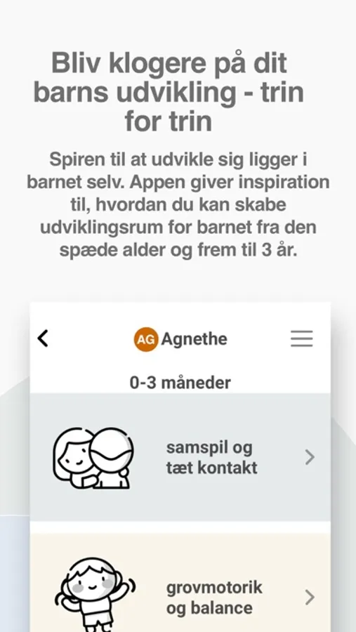 Fra fødslen til 3 år udvikler barnet sig til at kunne løbe, tale, tegne, danse og spille mv. Spiren til at udvikle sig ligger i barnet selv. Appen giver inspiration til, hvordan du kan skabe udviklingsrum for barnet fra den spæde alder og frem til 3 år.