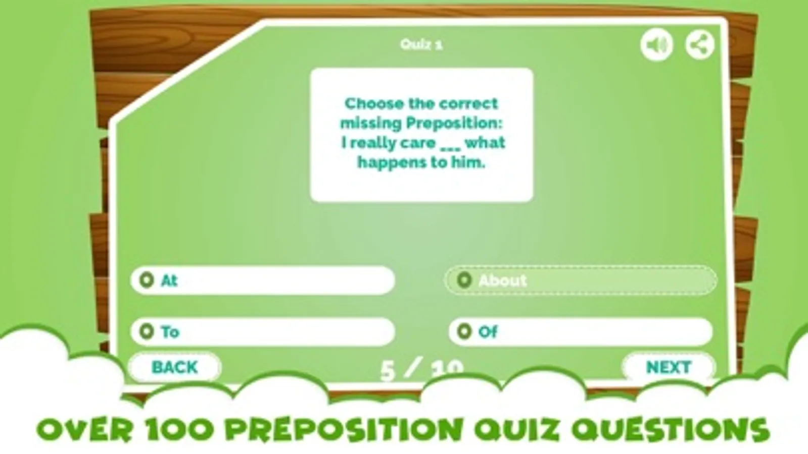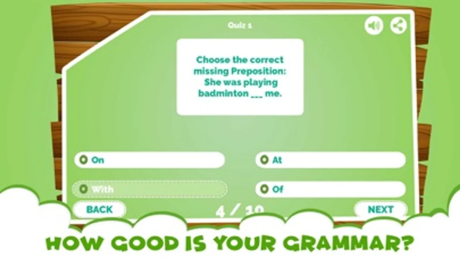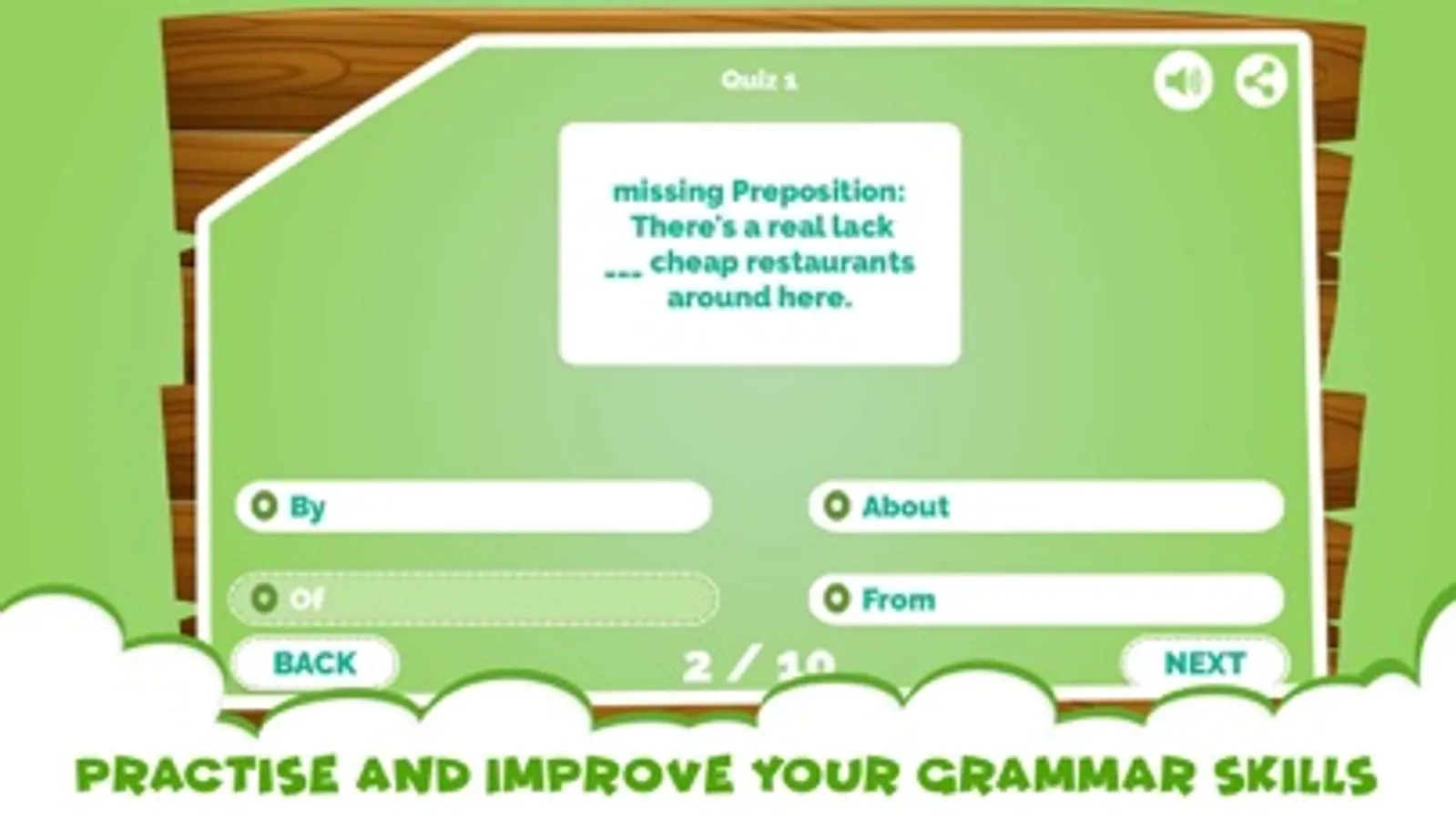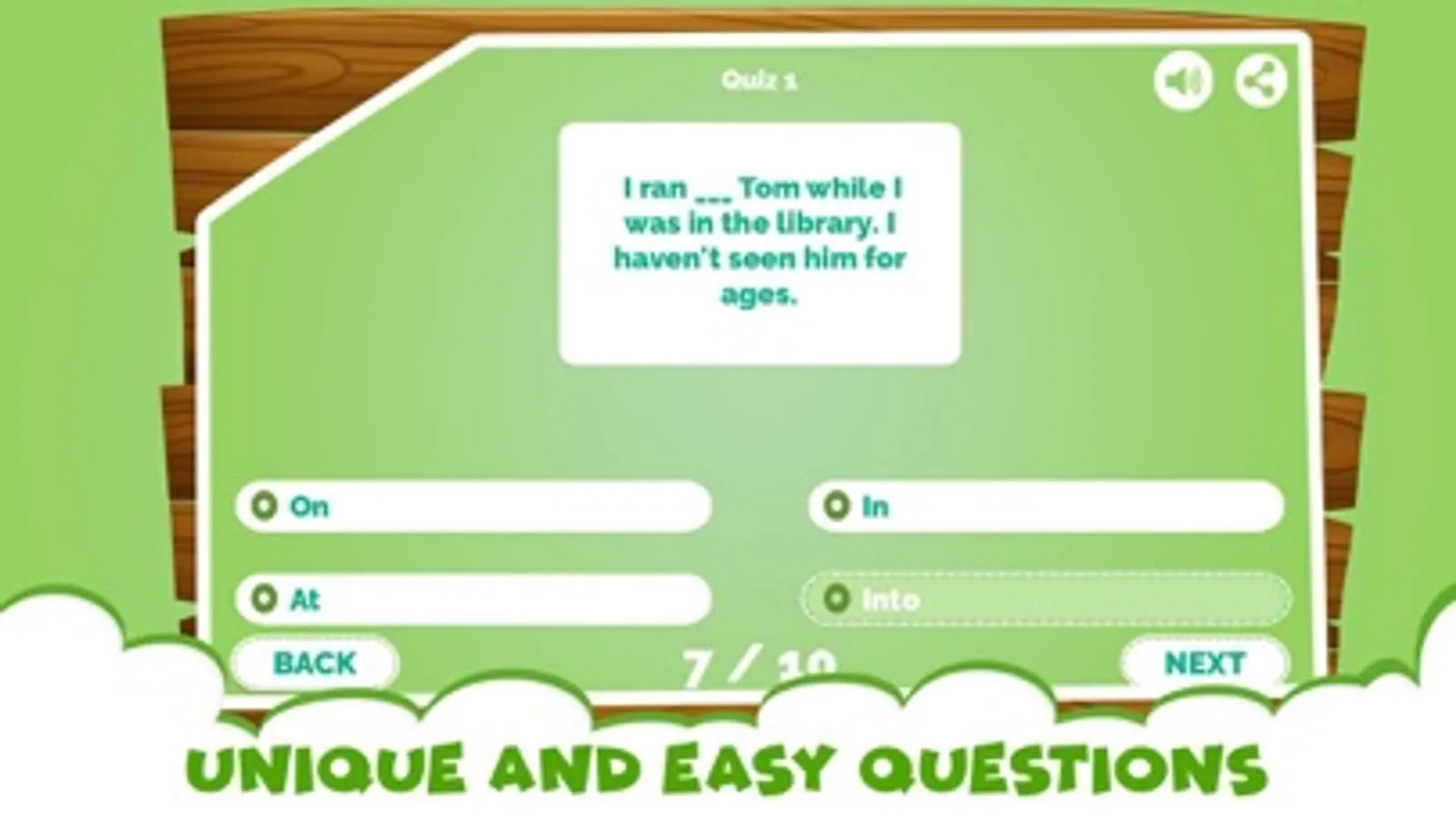 English Grammar Prepositions Quiz Game is an educational app for the kids to learn about the English grammar prepositions by taking the quizzes and the app will test their knowledge. This app will help the kids find out the correct answer to the given question by taking different English grammar prepositions quizzes. Children are encouraged in this English grammar prepositions game through interactions with a simple and beautiful graphical interface with great sounds. The kids will really enjoy playing this game as every little action has been well-defined, interactive and excellently designed for effortless game play.