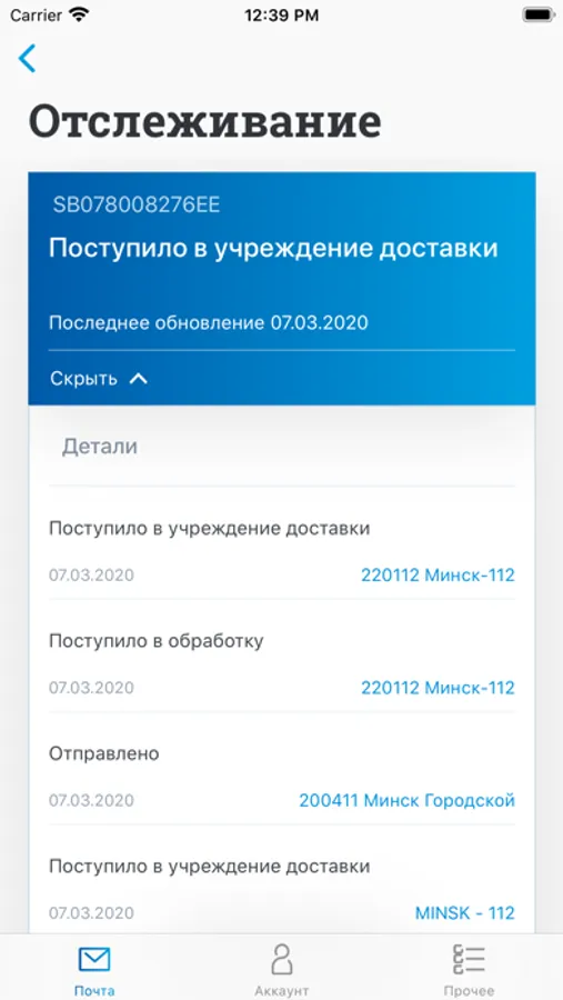 - отслеживание почтовых отправлений с возможностью сохранения истории