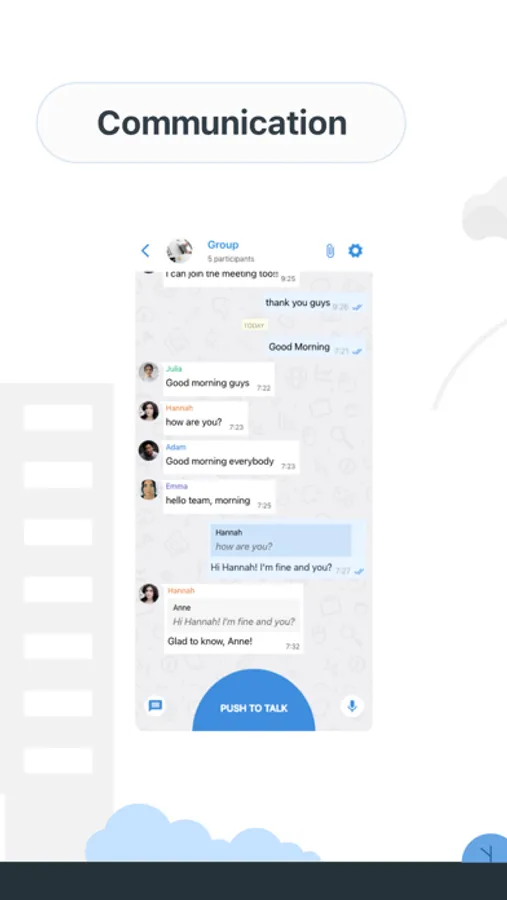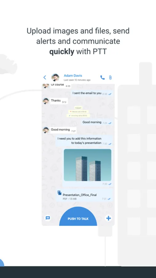 Quickly reply for unforeseen events. Leave behind the common radios and transform your team smartphones in true walkie-talkies (PTT) with a substantial functionality set of messenger and communication.