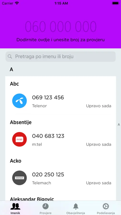 - Provjera cijelog imenika ili određenog broja
