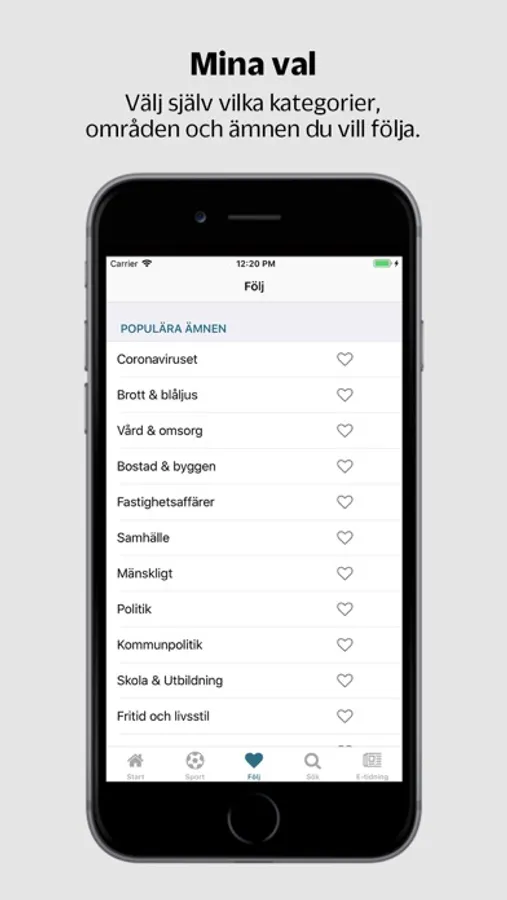 Med funktionen "följ" kan du enkelt bli notifierad vid händelser som intresserar dig. Välj själv vilka kategorier, områden och ämnen du vill följa genom att klicka på hjärtan. Du kan när som helst ändra dina inställningar.