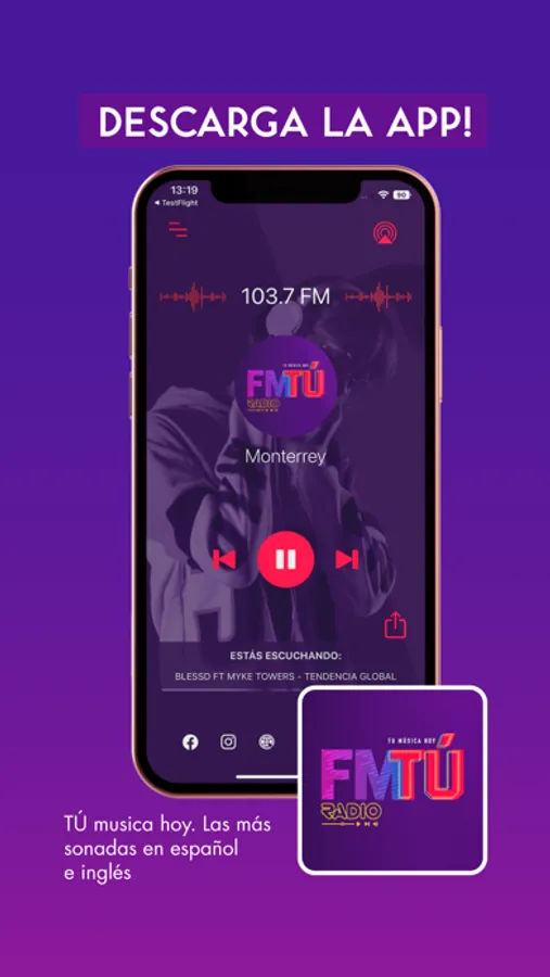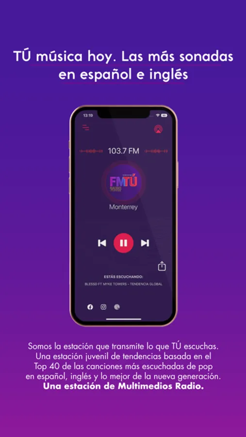 Somos la estación que transmite lo que TÚ escuchas. Una estación juvenil de tendencias basada en el Top 40 de las canciones más escuchadas de pop en español, inglés y lo mejor de la nueva generación. Tu música HOY en el 102.9 FM de Monterrey y 103.9 FM de Torreón. Lo dicen todos, lo dices TÚ, FMTÚ. Una estación de Multimedios Radio.