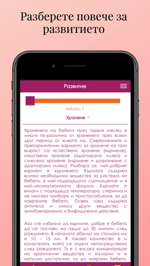 Информацията е подредена в няколко раздела за всеки месец от развитието на бебето:
