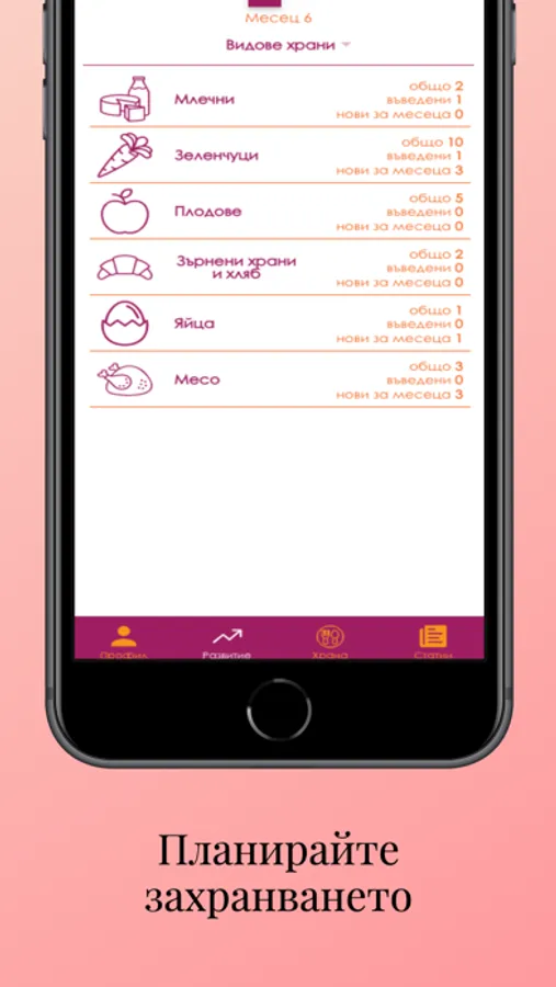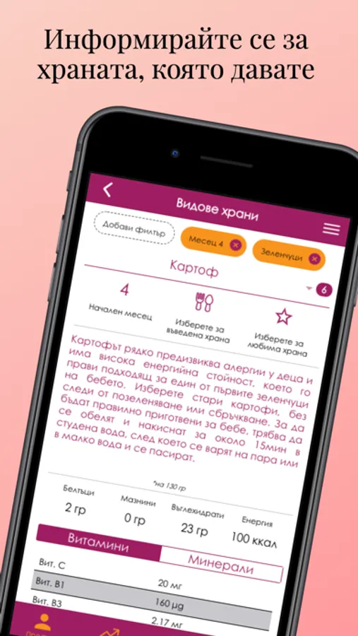 Можете да проверите за конкретна храна кога и как се препоръчва да бъде въведена в менюто на бебето Ви, както и съдържанието й на полезни вещества и тяхната концентрация.