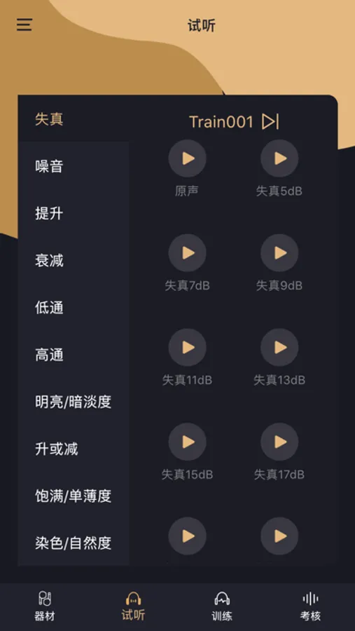训练 - 分为失真、噪声、提升、衰减、升或减、低通、高通、明亮/暗淡度、饱满/单薄度、染色/自然度10个级别。