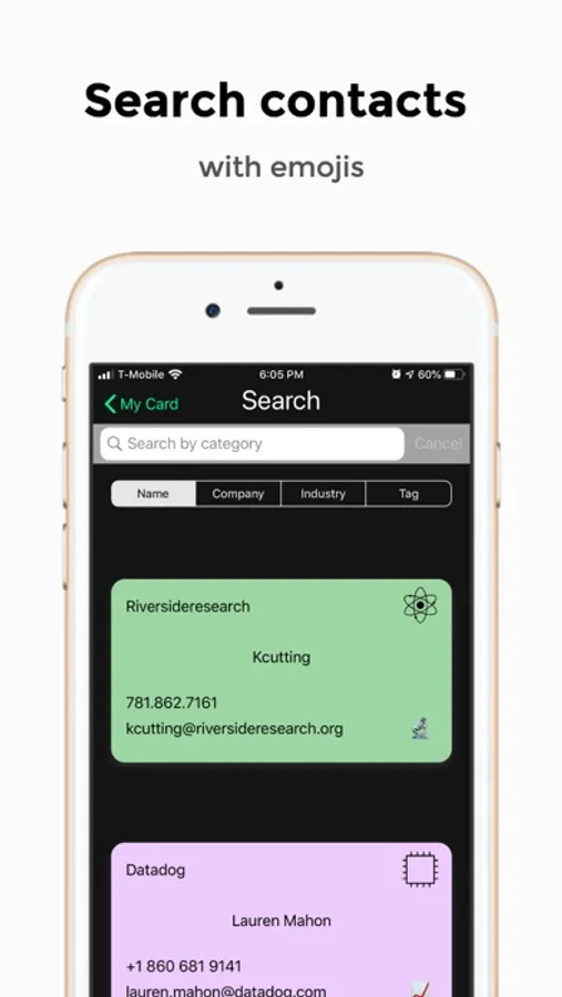 Looking for a contact but don't remember the persons name? Ico lets you search contacts by name, company, industry, or a custom category created by you.