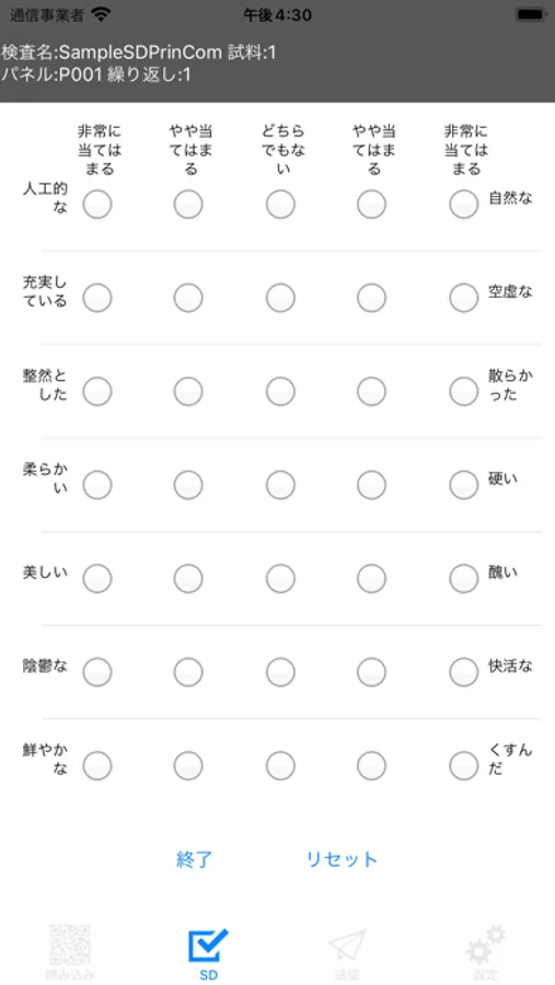 本アプリは、J-SEMS PROで作成された検査(一対比較法、採点法、順位法、SD法、QDA法)の実施を、iPhoneを使って行うものです。