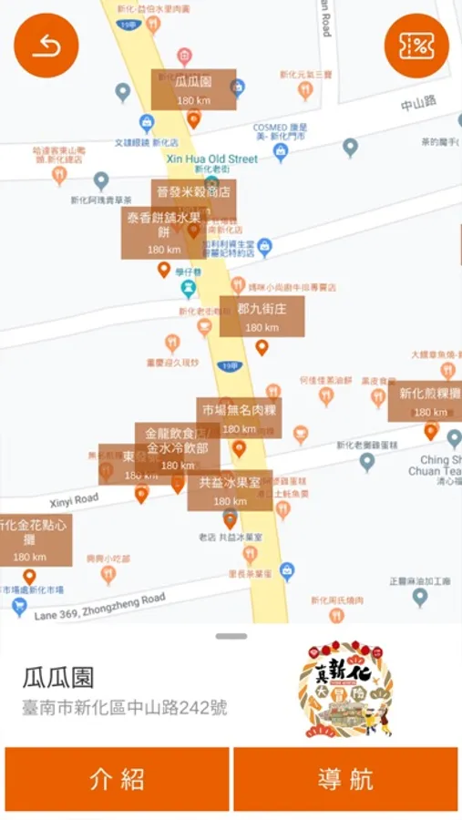 此款利用LBS(移動定位服務)、AR(擴增實境)技術開發的互動APP,以台南新化特色店家、景點為主的資訊介紹。