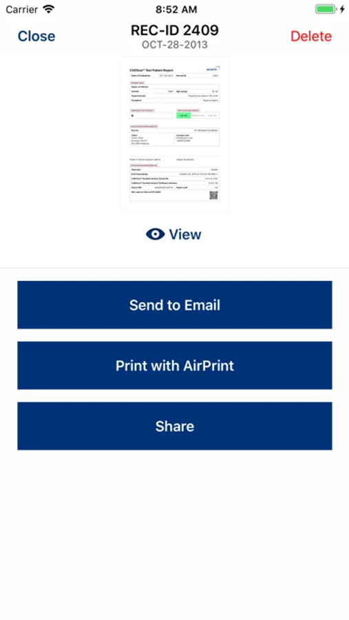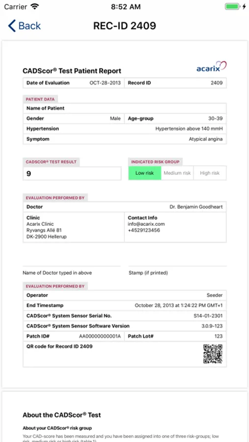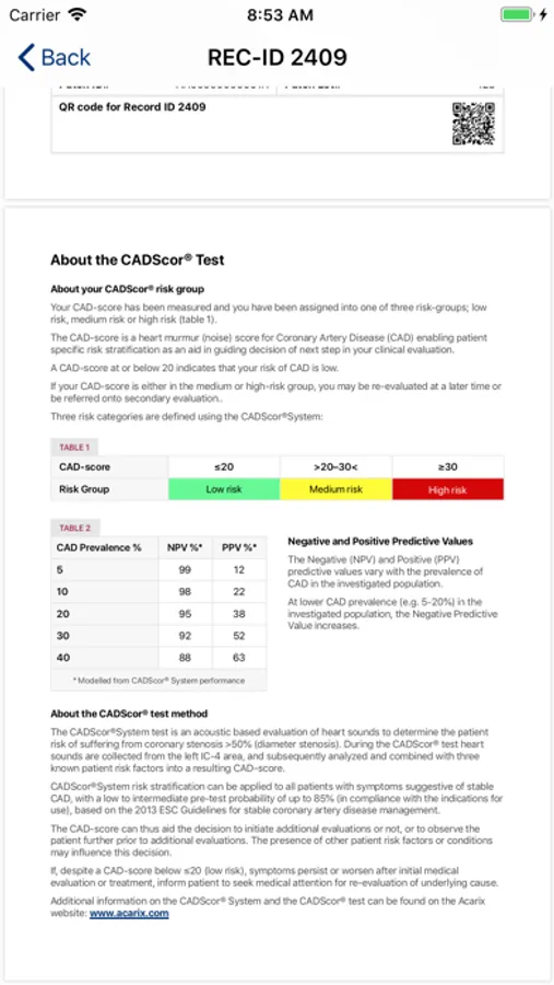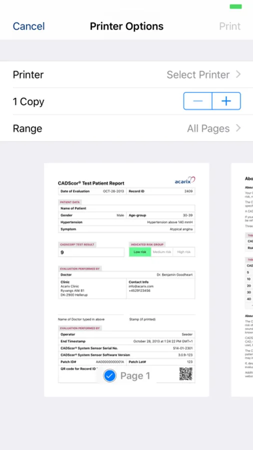 Scan the patients' CAD-score result directly from the QR-code on-screen with your smart phone or iPad to generate the patient report. The patient report can be sent to your own pre-defined email address or directly to your Air-print compatible printer or even to your patients' email address.