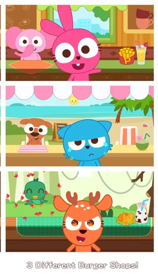 Three cute animals are running three different shops that serves different burgers: Purple Pink runs the most authentic burger shop, Colin the Cat runs the most dreamy burger shop where all burgers are created by desserts, and Helen the Deer runs a nutritious all vegetable burger shop!