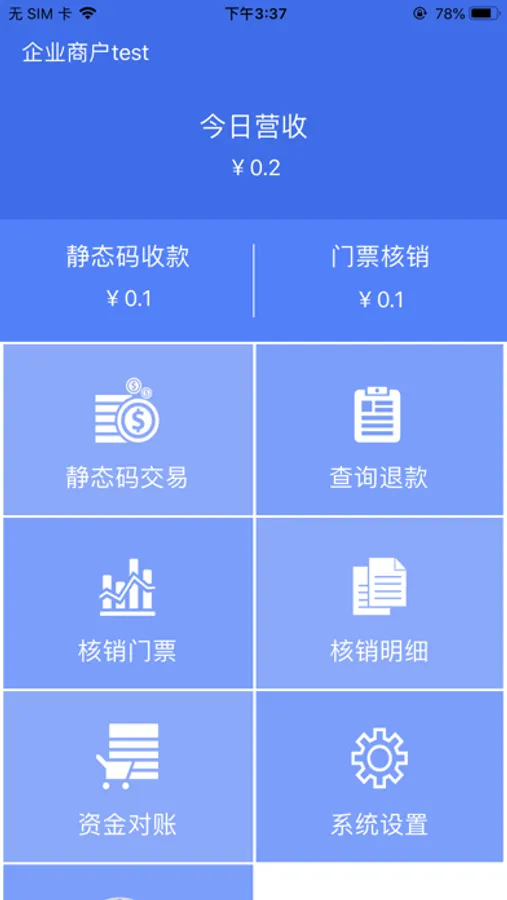用于园区内商户静态码收款到账即时语音播报,可核销门票。支持查看每日营收,查看交易明细,查看每日对账。