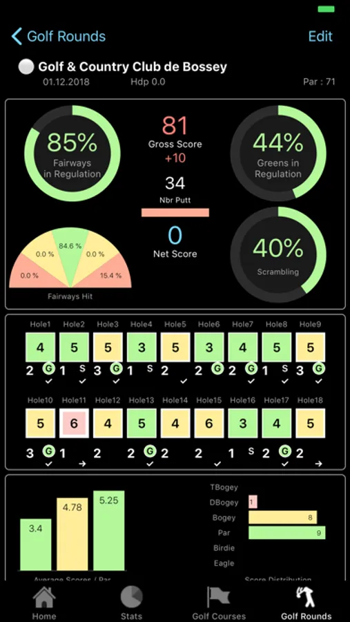 Follow your stats, Set your annual objectives, Enter your golf courses manually, Stats by years and golf courses (to know which hole to take care), Live scoring, No Internet connection needed, Enter your score after your round and past round...