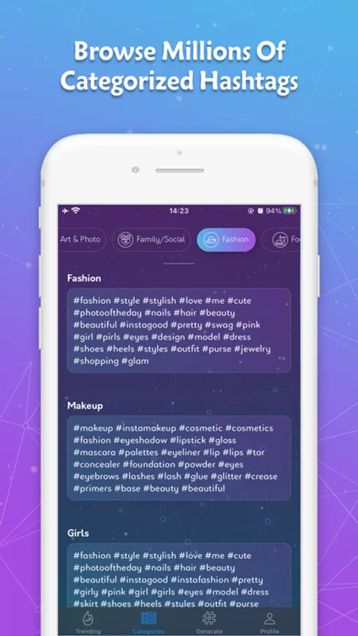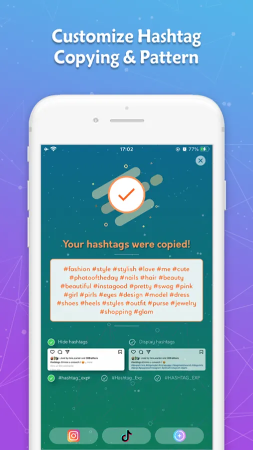→> Simply choose a hashtag name, tap "Copy" button or tap "Copy with Instagram" button(means copy and open that app) then open Instagram, Facebook or Twitter and paste on your pictures and posts!