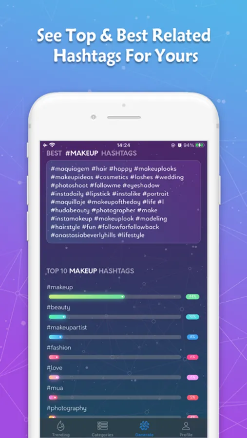 This app will help you to increase "likes" of your photos, posts and their rating. Just copy and paste necessary hashtags. It has all popular hashtags, implemented convenient search. You are able to add your own tags, mix them with existing and save them in a separate card for reusing. The app has a hashtag generator, which helps to generate a hashtags set.