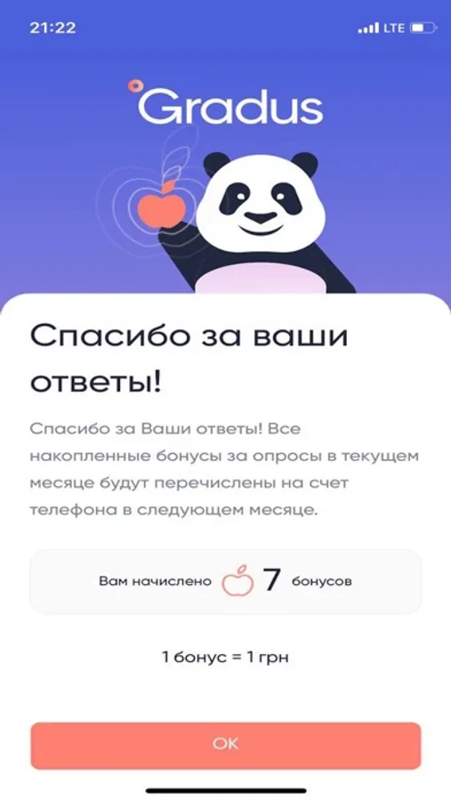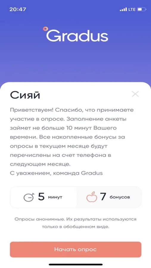 Gradus - приложение для участия в национальных опросах. Отвечайте на вопросы, накапливайте бонусы и рассчитывайтесь ими за мобильную связь. Ваше мнение будет влиять на важные для страны и бизнеса решения. Проходите опросы в свободное время, зарабатывайте бонусы, высказывайте свое мнение и узнавайте много нового!