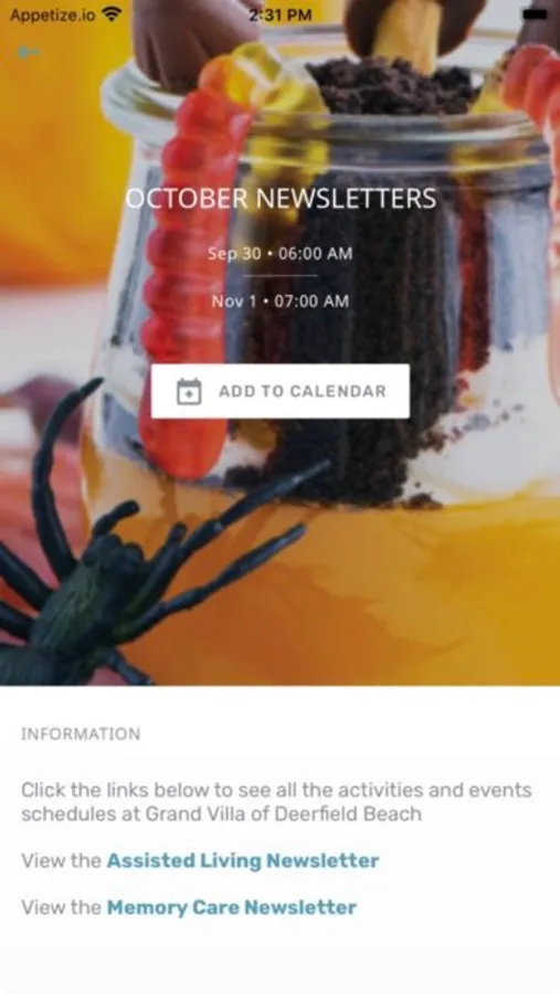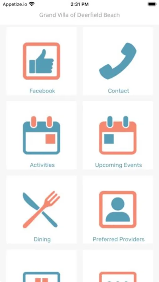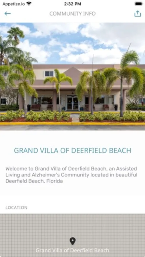 Our interactive phone app allows families to stay in constant contact with Grand Villa of Deerfield Beach and always know what's going on in the community. App includes: Pictures, Photos, Events, Newsletter, Menu, Contacts, Feedback, and more!