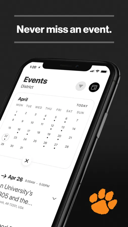 The event section shows a list of events throughout the district. Users can add an event to your calendar to share the event with friends and family with one tap.
