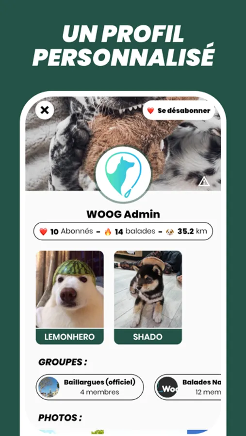- Profil personnalisé : Mettez en avant vos chiens, partagez des images, des publications, des stories, commentaires, likes ;