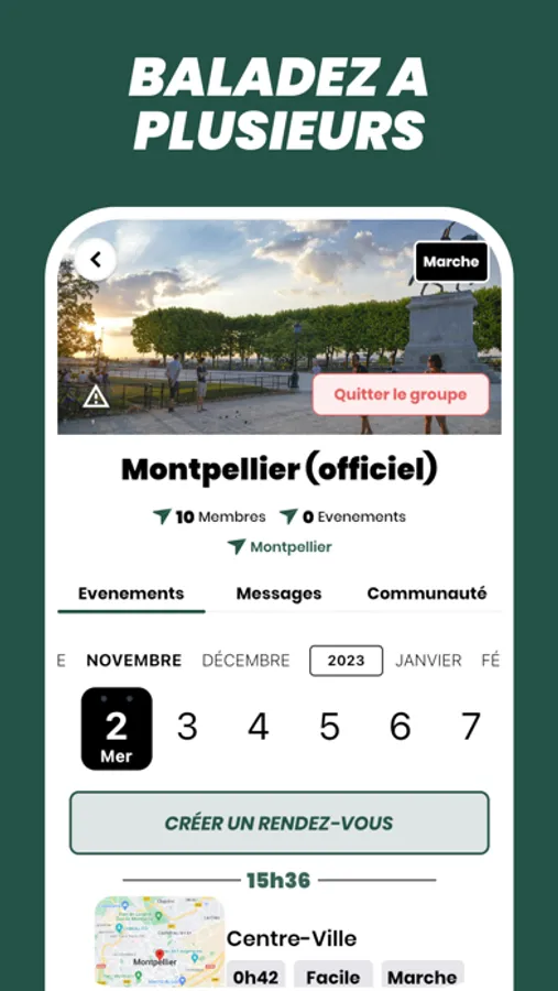 - Evénements pour des balades collectives : Créez et rejoignez des événements pour des promenades en groupe ;