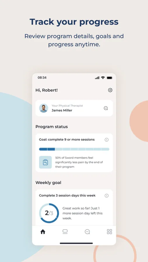 Sword Health helps you recover from musculoskeletal (MSK) conditions, injury, surgery, and physical pain all from the comfort of your home. We provide every member with a dedicated Doctor of Physical Therapy who will develop a personalized therapy program and provide continuous support throughout your journey. Once enrolled, we will also send you a Sword Kit with wearable sensors and a tablet that will guide you through your sessions so you can recover at your own pace.