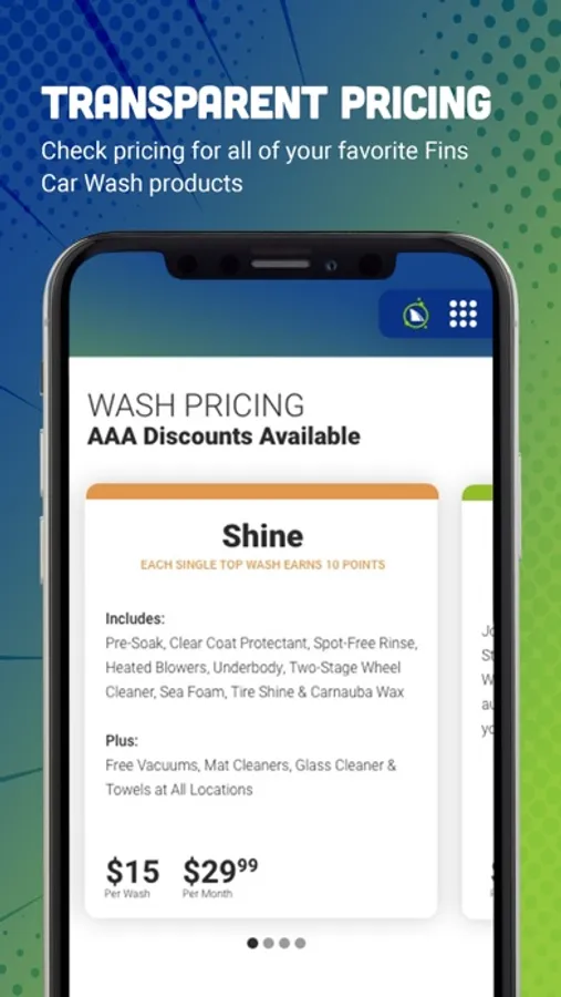 Fins Car Wash is a superior, exterior-only wash that delivers a high quality and memorable experience that will keep you coming back. Download Fins Mobile App and earn points with every purchase to use toward rewards. Plus, if you are an active AAA Member you can validate your membership to unlock additional savings.