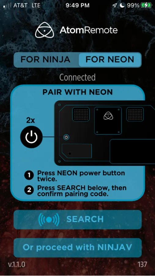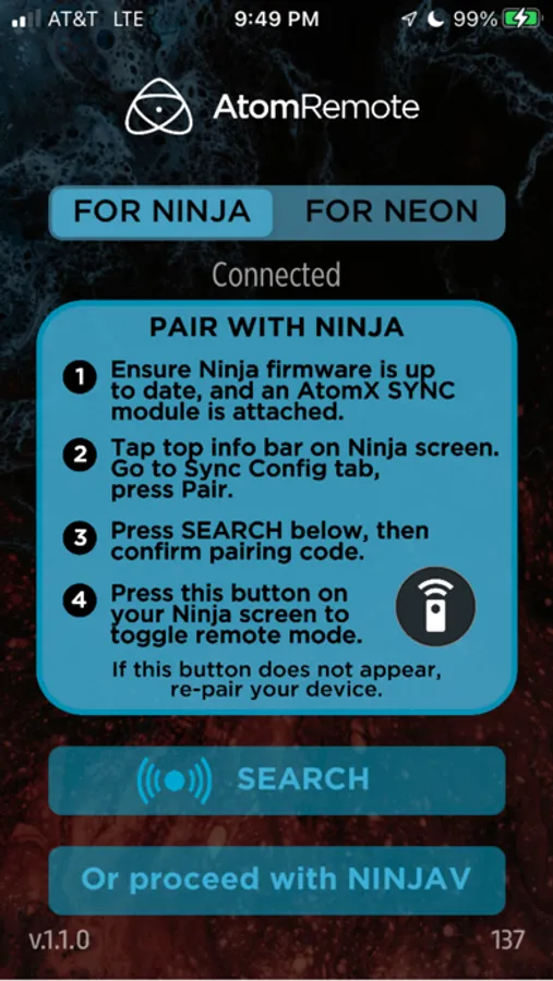 The AtomRemote app provides external controls for ATOMOS devices including the Shogun CONNECT, NEON 17, and NEON 24; as well as the NINJA V and NINJA V+ equipped with the ATOMOS CONNECT accessory or an AtomX SYNC module.